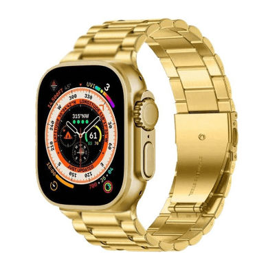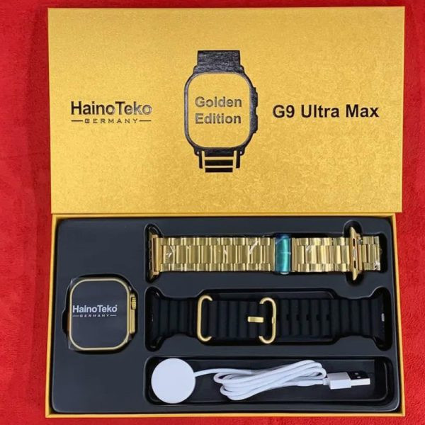 اسمارت واچ Haino Teko G9 Ultra Max محصولی جدید و زیبا در سال 2023 شرکت هاینو تکو آلمان است که به جرات میتوان گفت یکی از بهترین اسمارت واچ های طرح اپل بازار می باشد این محصول دارای امکاناتی هم چون بلوتوث کال ، اسمارت نوتیفیکیشن ، NFC ، قطب نما ، بارو متر ، اندازه گیری فشار خون ، اکسیژن خون ، گام شمار ، کنترل وضعیت خواب و بی تحرکی ، وضعیت اب و هوا ، حالات مختلف ورزشی و … است . این محصول از صفحه نمایش 320×380 پیکسلی با وضوح HD و اندازه 2.2 اینچی IPS بهره میبرد که کیفیت فوق العاده ای را به نمایش میگذارد همچین از صفحه ای ضد خش و ضد ضربه بهره مند است که ایمنی قابل قبولی را به ساعت می بخشد علاوه بر این در بسته بندی محصول یک بند مشکی سیلیکونی و یک بند فلزی طلایی به چشم میخورد که میتوان از آن ها متناسب با هر سلیقه و شرایطی استفاده کرد . از دیگر ویژگی های این اسمارت واچ وجود میکروفون و اسپیکر است که امکان مکالمه واضح و شفافی را فراهم کرده از طرفی وجود باطری 280 mAh آن امکان شارژردهی 2-5 روزه در حالت نرمال و 7 روزه در حالت استندبای را امکان پذیر میکند وجود شارژر مغناطیسی و فست شارژ از دیگر مزایای محصول به شمار می آید ، در مجموع این محصول با امکاناتی فراوان و قیمتی مقرون به صرفه به راحتی میتواند با برند های مطرح بازار رقابت کند و نظر هر مشتری را به خود جلب نماید