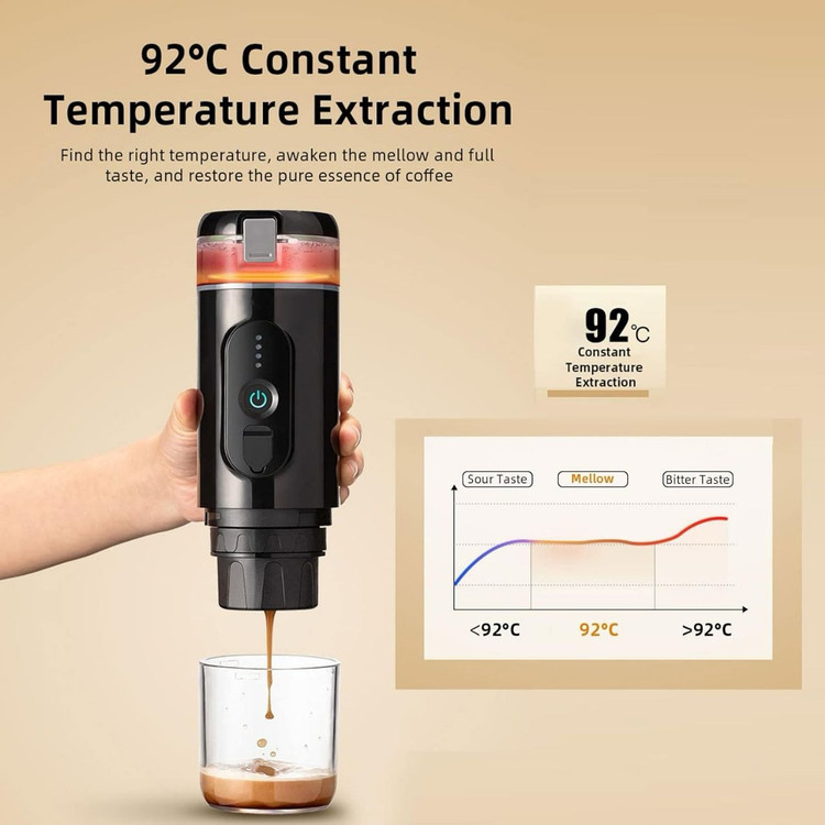 مجهز به سه باتری با راندمان بالا 2500mah، در مجموع بسته باتری 7500mah که می تواند برق قدرتمندی را برای قهوه ساز فراهم کند، از شارژر 12 ولت و USB پشتیبانی می کند، از قهوه در هر کجا و هر زمان لذت ببرید. مجهز به سیستم مدیریت باتری BMS، میتوانید اسپرسو را با گرم کردن آب سرد 4 تا 5 بار استخراج کنید در صورت داشتن شارژ کامل ، و 100 بار دیگر در صورتیکه که خودتون آب داغ را به آن اضافه کنید.