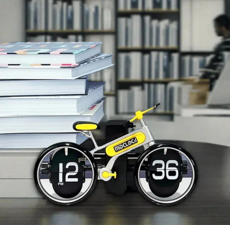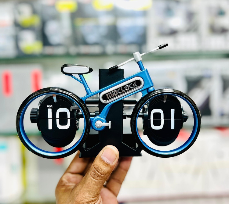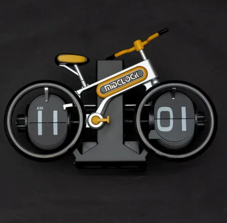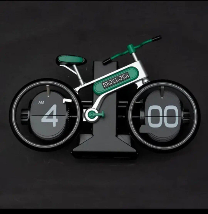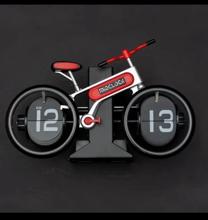 یک ساعت رومیزی با طرح دوچرخه است که طراحی مینیمال و جذابی دارد و برای کسانی مناسب است که به طرحهای مینیمال علاقه دارند.