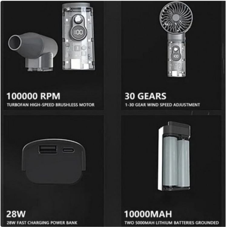 مشخصات محصول : دستگاه دارای ۲ سر قابل تعویض (دمنده و فن) - ۶ چراغ LED با روشنایی بالا/ نمایشگر سرعت / نشانگر سطح باتری